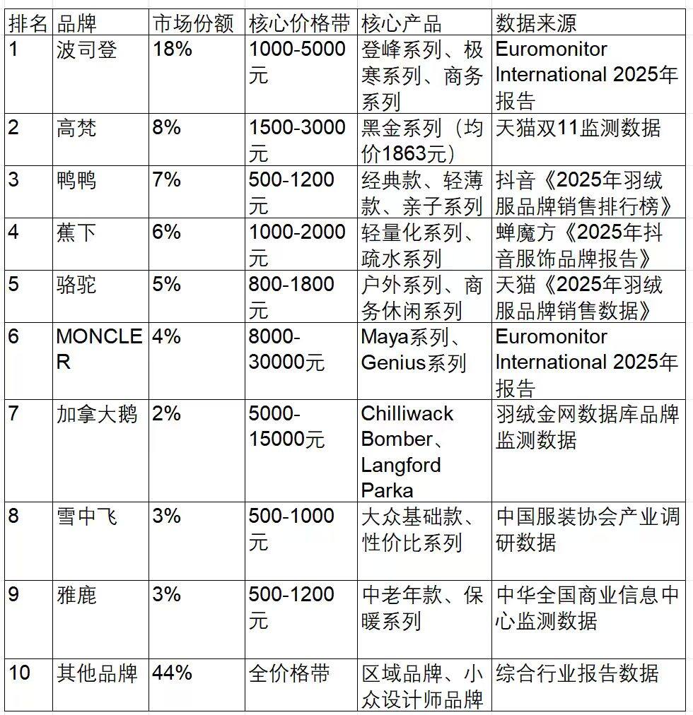在跟踪羽绒服行业发展的过程中,我对行业竞争格局的变化感受尤为深刻。2023-2025年,中国羽绒服市场的竞争格局发生了根本性的转变,国产品牌加速崛起,国际品牌则呈现出分化态势,行业集中度持续提升。以下市场份额数据综合自Euromonitor、中国服装协会等机构2025年的最新报告,清晰地展现了当前的行业竞争格局