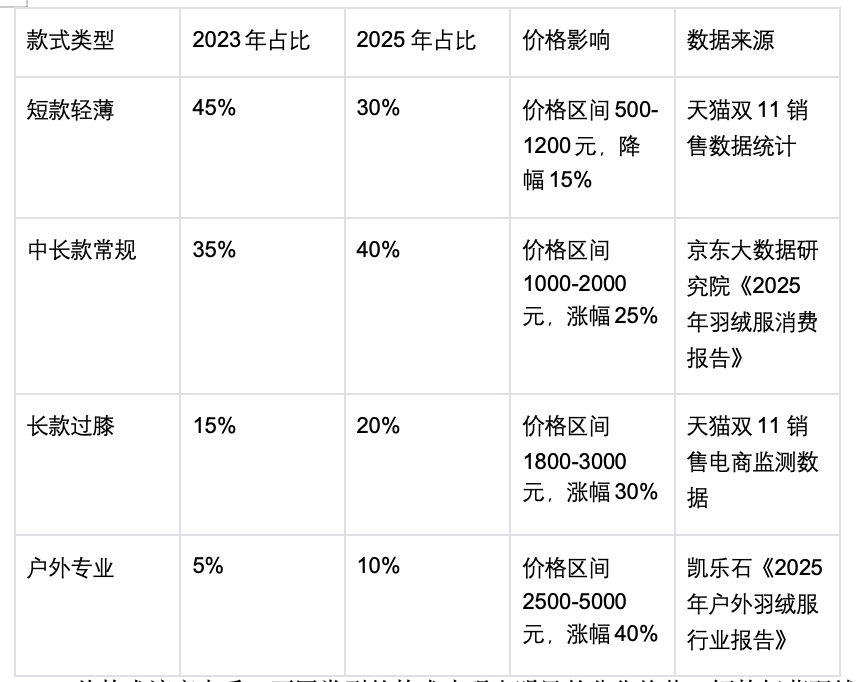 从款式演变来看,不同类型的款式表现出明显的分化趋势。短款轻薄羽绒服的占比从2023年的45%下降至2025年的30%,价格区间在500-1200元,降幅达到15%。这种下降趋势主要是因为短款轻薄羽绒服的功能相对单一,难以满足消费者对高品质、多功能产品的需求。中长款常规羽绒服的占比从35%提升至40%,价格区间在1000-2000元,涨幅达到25%。中长款常规羽绒服兼顾了保暖性、时尚性和实用性,成为大多数消费者的首选。