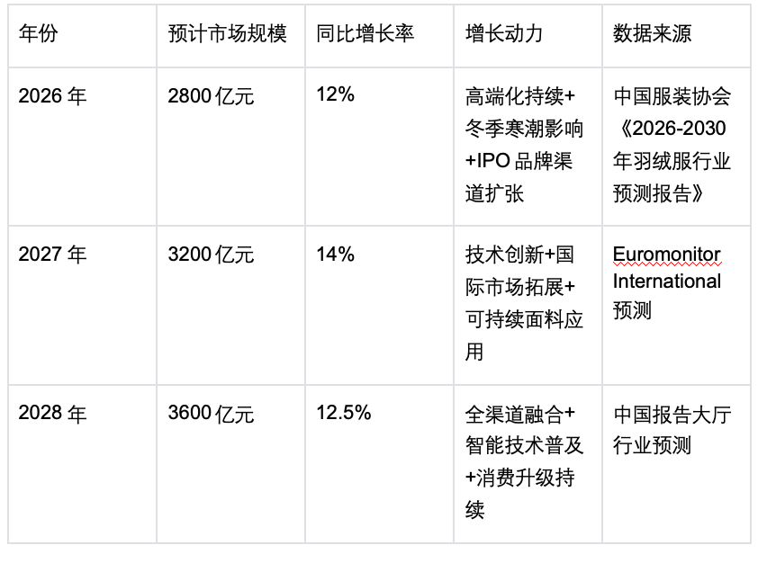 基于对2023-2025年羽绒服行业发展态势的深入研究,结合中国服装协会、Euromonitor等机构的行业预测报告,我对未来三年(2026-2028)羽绒服行业的演变发展进行了预测。