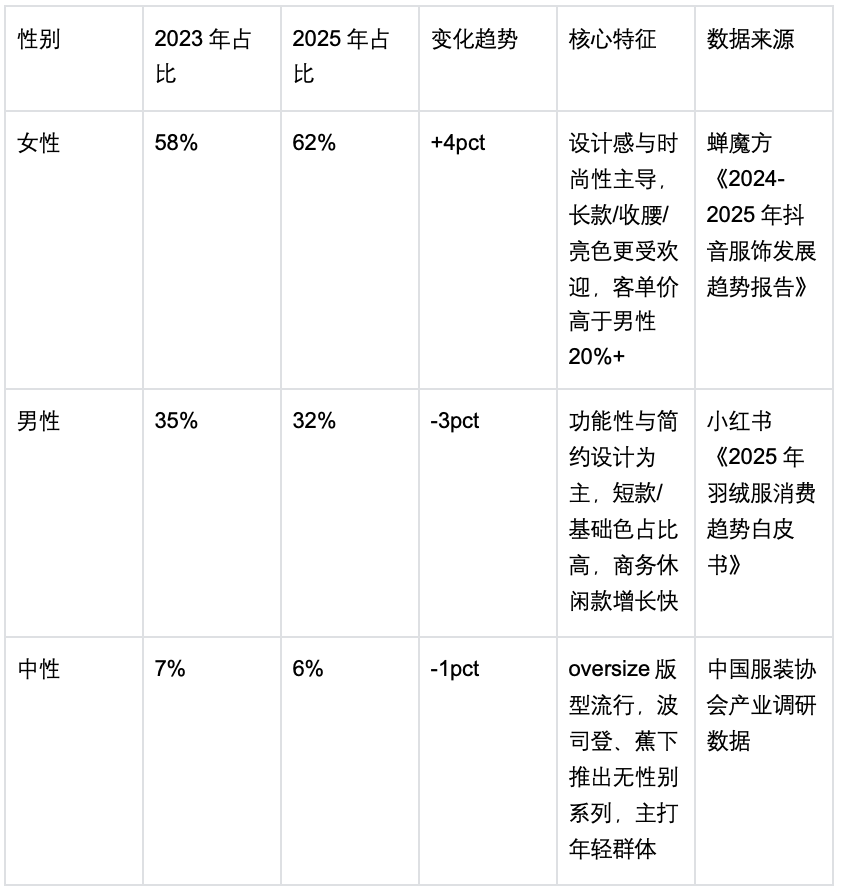 在研究羽绒服市场的性别占比变化时,我发现女性市场已经成为行业增长的核心引擎,同时中性化也在逐渐加强,这一趋势对品牌的产品设计、营销策略产生了深远影响。