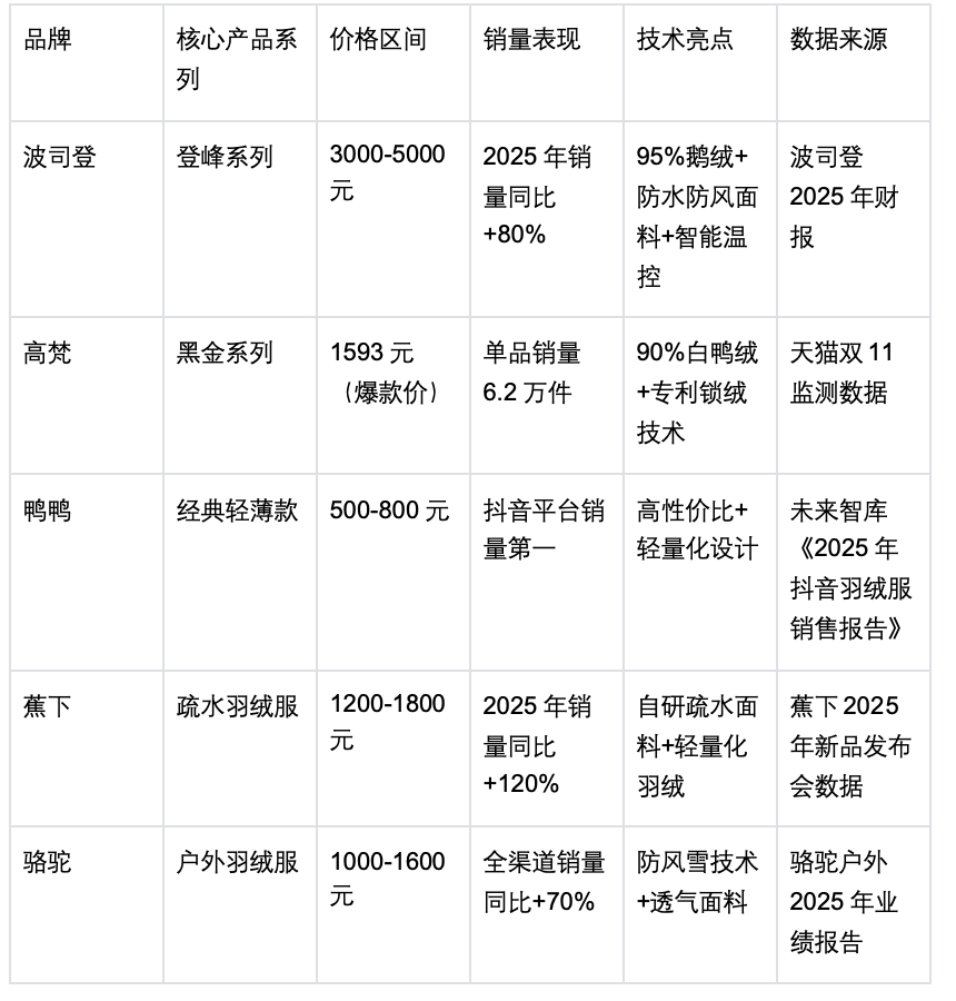 2023-2025年,羽绒服行业呈现“爆款单品驱动增长”的特征,核心产品的技术创新与定位,直接决定上市企业的营收表现与市场份额,相关数据结合企业财报与电商监测整理: