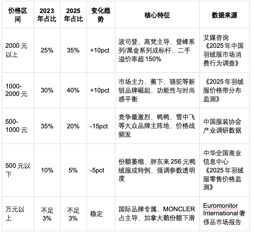 在研究价格带变化的过程中,我对行业的高端化趋势有了更直观、更深刻的认识。通过整合艾媒咨询、中国服装协会等多家权威机构2023-2025年的监测数据,我发现羽绒服市场的价格结构正在发生剧烈重构,高端化已经成为不可逆转的趋势。
