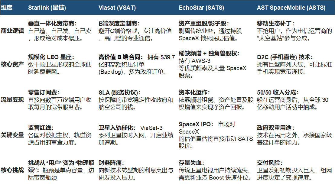 卫星通信行业正在经历一场“从高空到低空”的代际革命。竞争格局呈现低轨(LEO)以规模驱动增长、同步轨道(GEO)向资产轻量化转型、以及手机直连(D2C)填补生态真空的深度分化态势。星链垂直一体化优势突出,低时延宽带主导C端,星链Starlink计划发射上万颗卫星,这占用了大量的频率资源和近地轨道空间,其规模效应在带来网络优势的同时,也引发国际社会对太空可持续性的审慎监管——包括碎片减缓要求强化、频谱协调机制完善等,但尚未构成实质性扩张障碍。Viasat/EchoStar护城河在B端定制化,EchoStar通过SpaceX持股成影子股,Viasat聚焦新国防科技和多轨道网络。AST SpaceMobile采取“非竞争性集成”策略,通过与全球运营商建立 50/50 收入分成机制,将其巨型相控阵卫星转化为地面网络的“天基蜂窝基站“。以下表格总结核心维度对比: